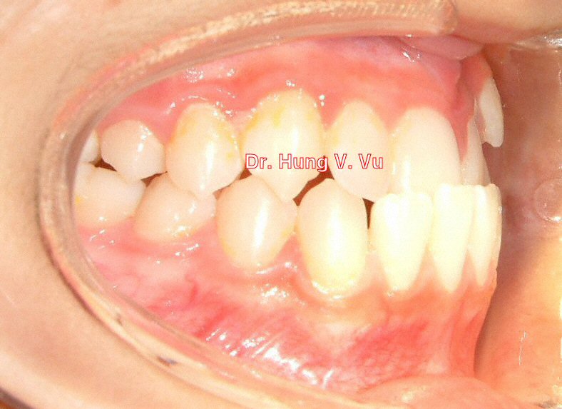 This case is skeletal Class III (moderate, with Class III malocclusion, with molars not shown); treated without orthognathic surgery and without extraction. Patient wanted no orthognathic surgery.