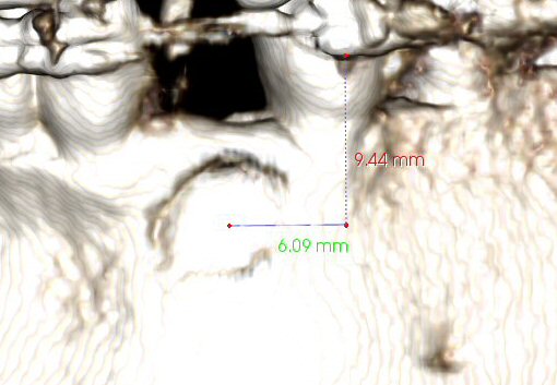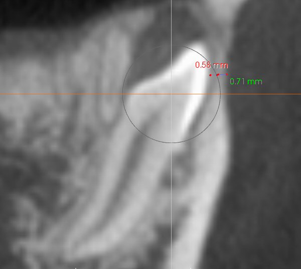Fig. 18 CBCT, showing ~ 0.7 mm of cortical bone that must be removed, with ~ 0.6 mm space before touching the crown.