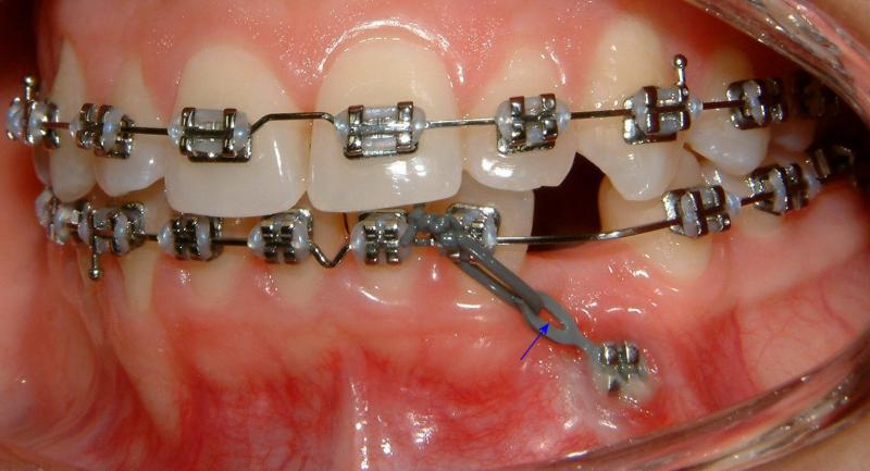 Without surgical exposure and forced eruption, there was practically very little progress with natural eruption of the upper right canine for nearly 3 years (not shown). With the surgical exposure (laser -> no bleeding) and forced eruption, the progress can be seen almost immediately - within a month (Fig. 9). After 2 months, the crown is more visible: part of the crown can be seen clearly (Fig. 10). After 8 months, the crown is moved into the position (Fig. 11). With additional 3 months, the crown is relatively well leveled and aligned (Fig. 12). It takes longer to treat the palatally impacted canine.