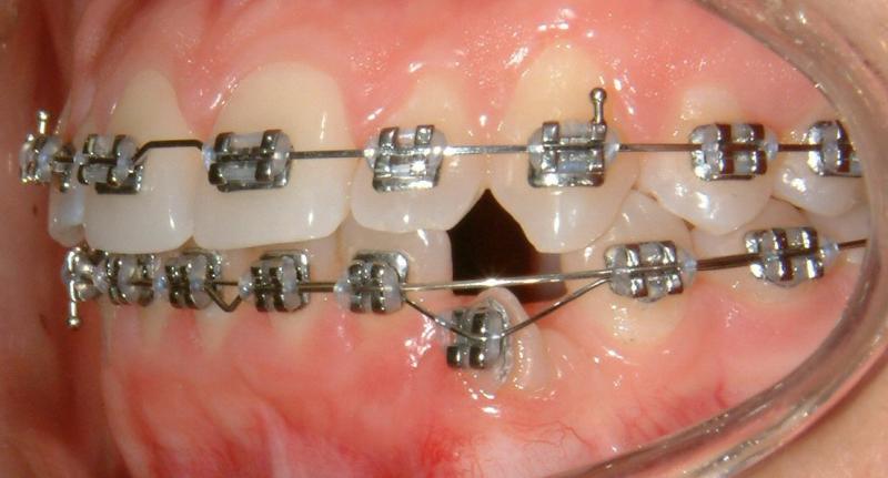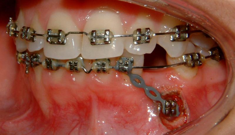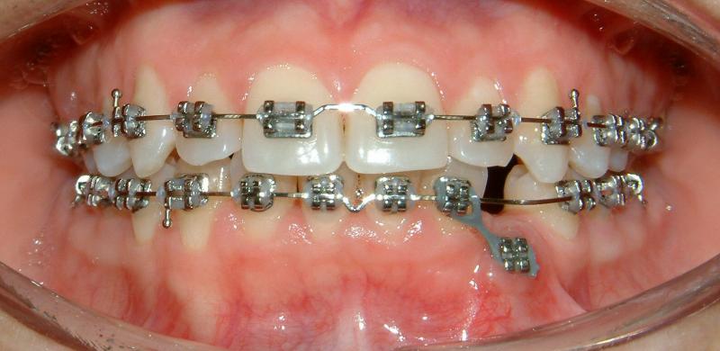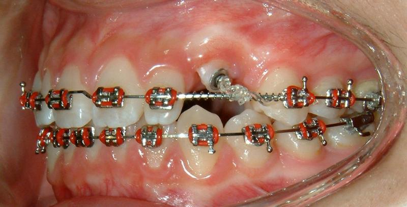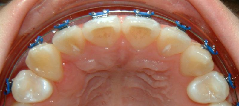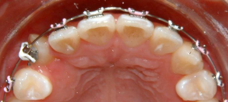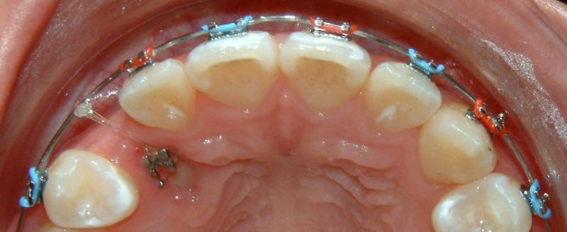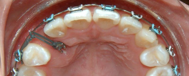 Without surgical exposure and forced eruption, there was practically very little progress with natural eruption of the upper left canine for nearly 2 years (not shown). With the surgical exposure (laser -> no bleeding) and forced eruption, the progress can be seen almost immediately - within a month (Figs. 3-5), and a complete success in four months (Fig. 6).