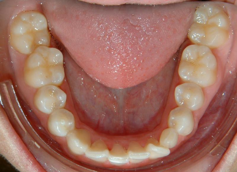 Fig. 15 Initial photograph of impacted lower left canine - unerupted (at 16 y.o., with existing deciduous canine).