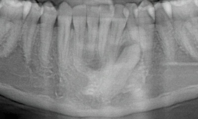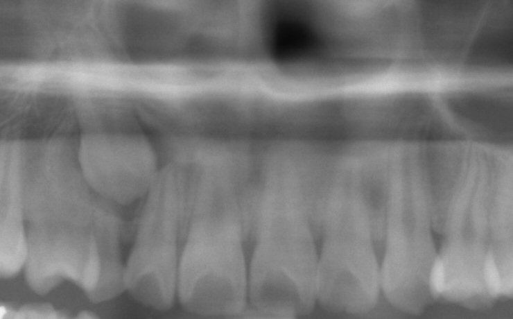 Fig. 13 Initial panoramic radiograph (cropped) of impacted lower left canine (at 16 y.o.)
